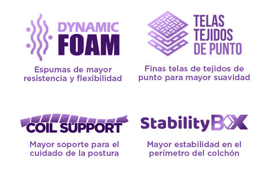 - Estabilidad superior StabilityBox: Tecnología perimetral que garantiza mayor estabilidad en todo el perímetro del colchón, eliminando el efecto de hundimiento en los bordes y maximizando la superficie útil de descanso para mayor durabilidad y confort consistente.