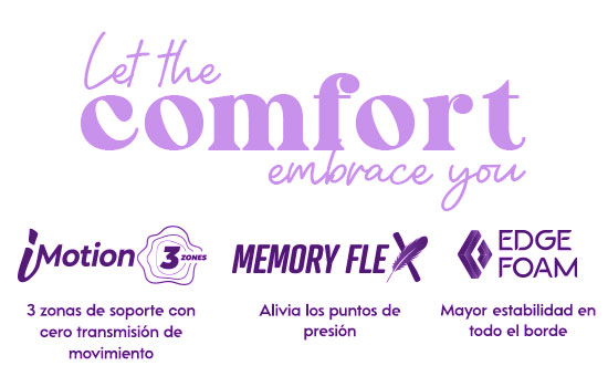 - Cero transmisión de Movimiento, por medio de la incorporación de sistema de resortes I-motion® 3 Zonas, que trabaja de manera inteligente, cada resorte funciona independientemente dando el soporte justo donde el cuerpo lo necesita a la vez que reduce la transmisión de movimientos.